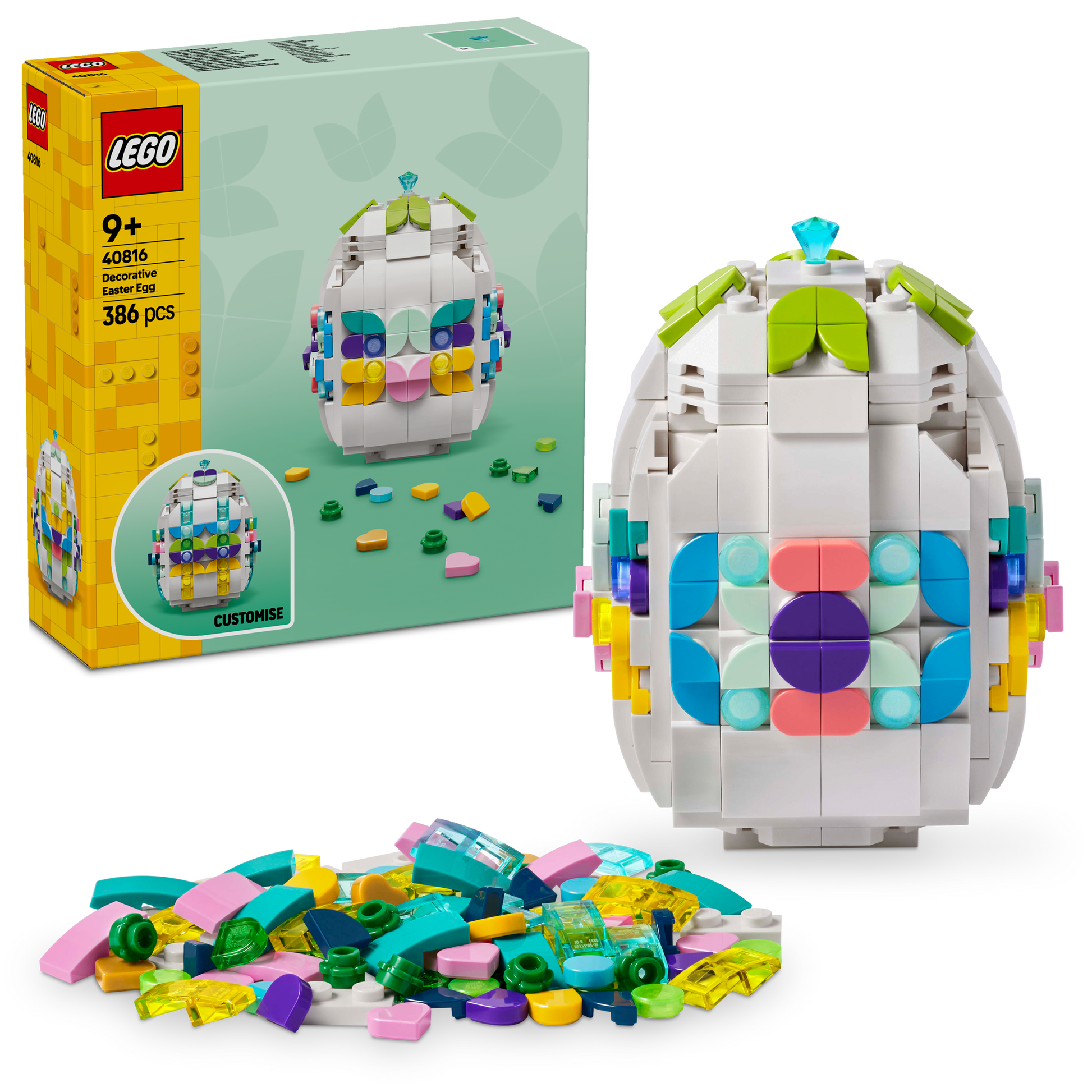 - De set bevat een vrolijke mix van LEGO stenen in verschillende kleuren en vormen, perfect om je ei te versieren.