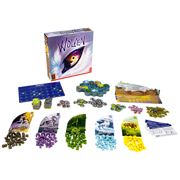 Betreed de meedogenloze wildernis in Wolven, een strategisch gebiedscontrolespel voor 2-5 spelers. Kruip in de huid van een alfa-paar en leid je roedel om territorium te claimen, prooien te jagen, je roedel uit te breiden en uiteindelijk de dominantste roedel in het landschap te worden. Met zijn unieke actiesysteem, dynamische interactie en thematische diepgang biedt Wolven een intense en boeiende spelervaring voor liefhebbers van strategische bordspellen.