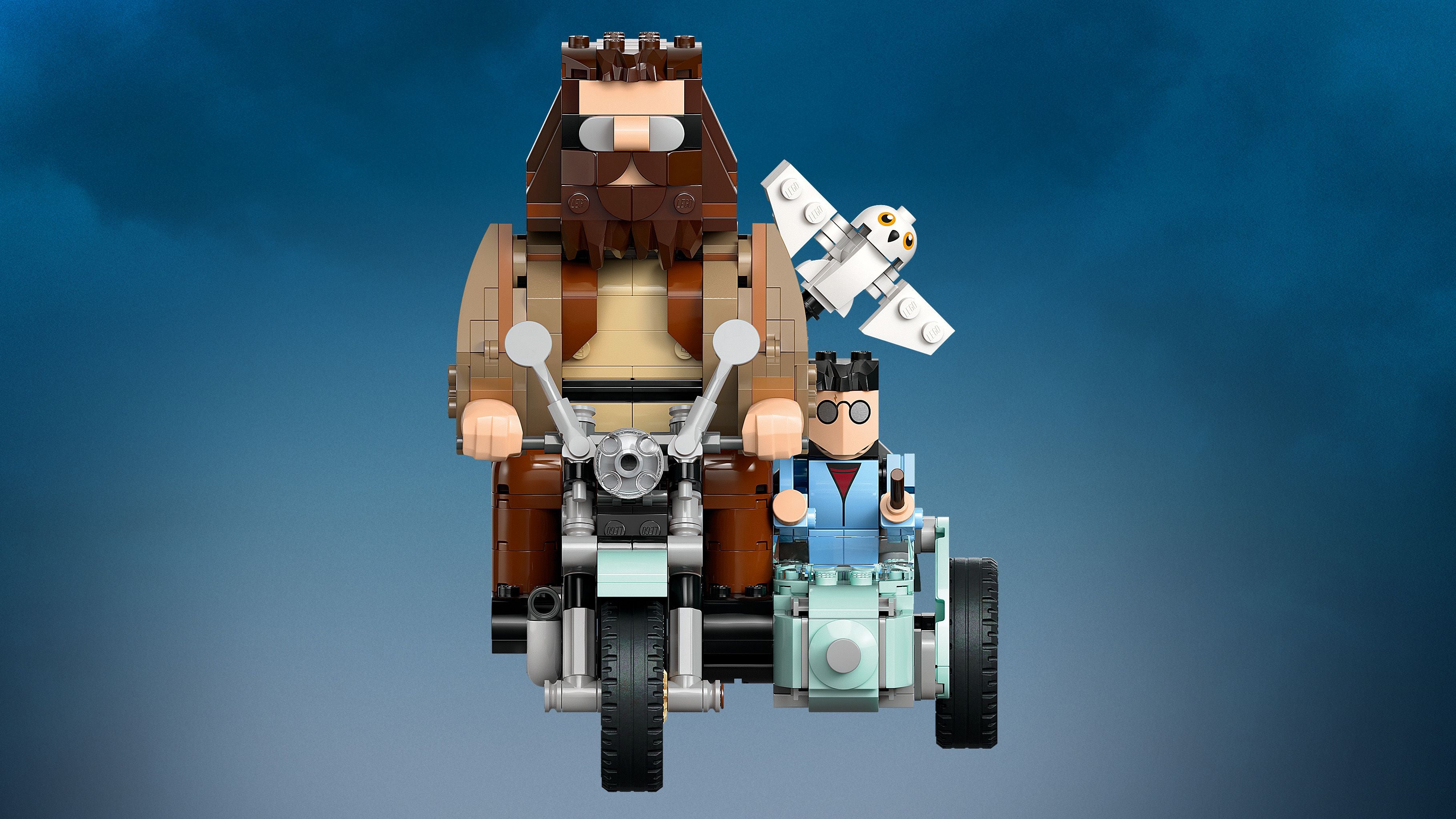 3 Harry Potter™ personages van LEGO® stenen – het model heeft ingebouwde, verstelbare Harry Potter, Hedwig™ en Rubeus Hagrid™ speelgoedfiguren die op Hagrids vliegende motor en zijspan rijden